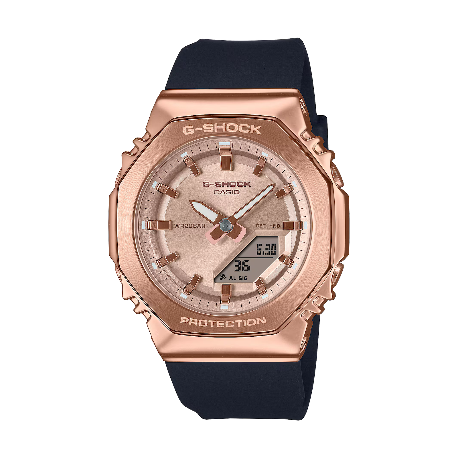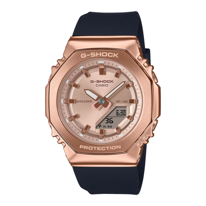 Solide, résistant et stylé : le revêtement métallique se pare de nouvelles couleurs. Dotée du boîtier octogonal emblématique, la GM-S2110 se décline désormais en trois nouvelles associations de couleurs : rose doré et noir, rose doré et rose beige, et gris foncé. Les éléments métalliques du cadran ajoutent de la brillance et de la texture, tandis que la taille compacte assure un ajustement confortable pour les poignets plus fins. Sophistiqué et minimaliste, son design s’adapte à tous les styles vestimentaires, et la montre se porte aussi bien avec une tenue élégante, que décontractée. Le boîtier et le bracelet sont notamment fabriqués à partir de résine biosourcée, un matériau choisi parce qu’il contribue à réduire l'impact sur l’environnement