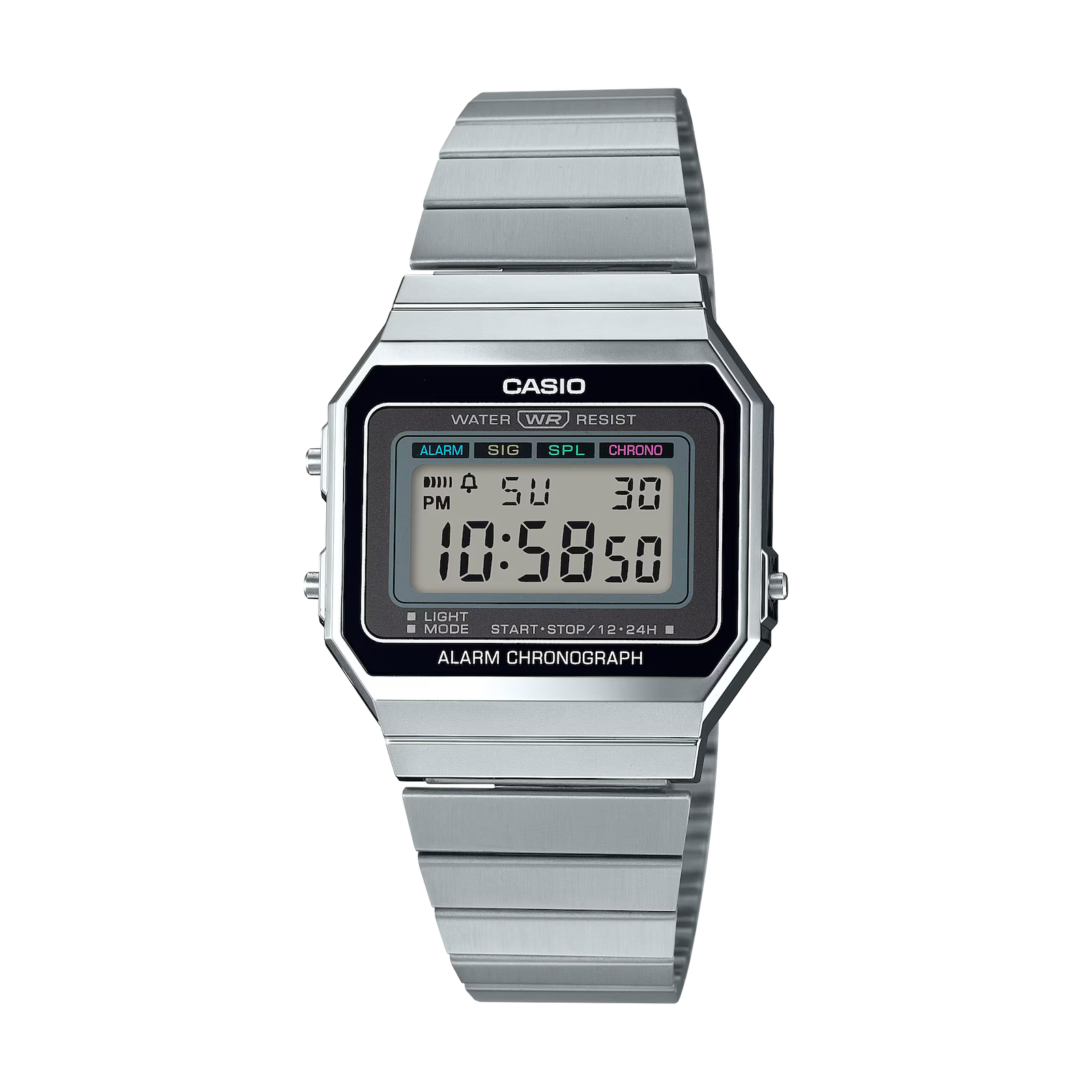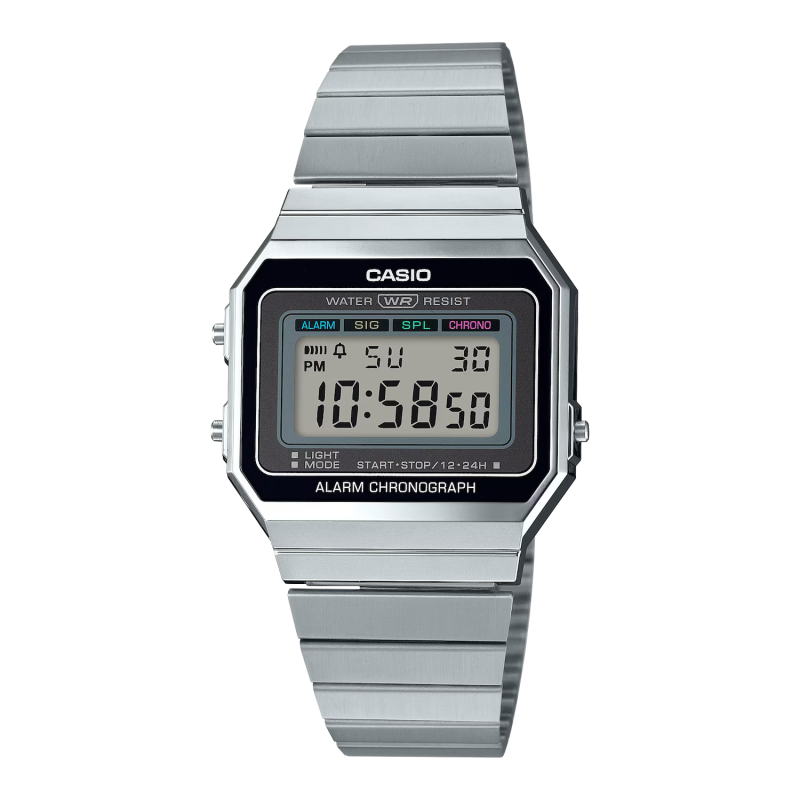 • BOÎTIER ULTRAFIN • Résistant à l'eau • Rétroéclairage LED • Chronomètre à 1/100e de seconde • Alarme quotidienne • Bracelet en acier inoxydable