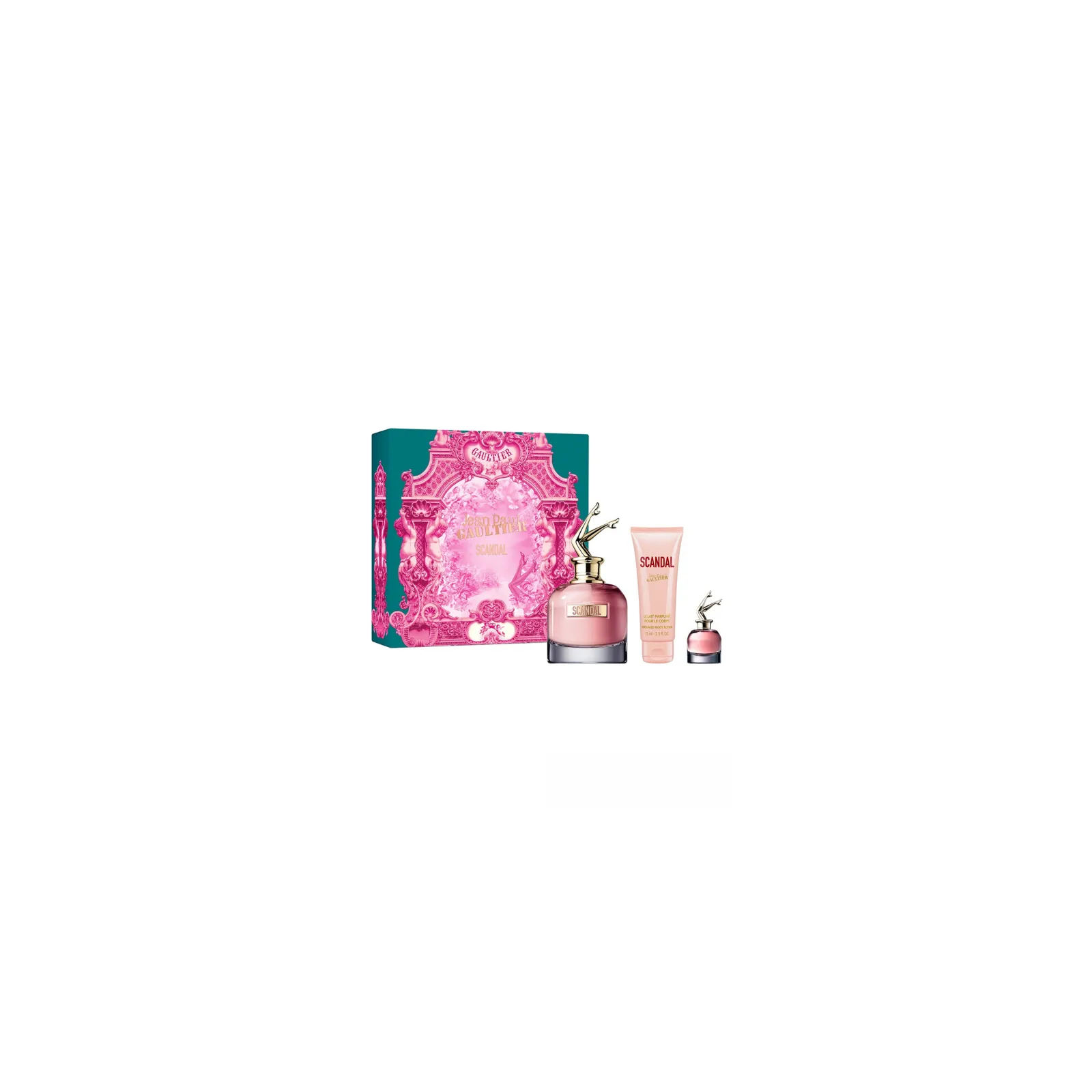 Scandal Eau de Parfum 80 ml + Lait corporel parfumé 75 ml + Eau de Parfum 6 ml.